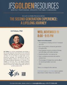 I am honored to be giving over Zoom TOMORROW (Wed. Nov. 19) evening, beginning at 8 pm EST, a presentation entitled “The Second Generation: A Lifelong Journey“, as part of the Golden Resources series of monthly lectures organized by the JFS in Clifton-Passaic, NJ. More information about the lecture series can be found by clicking on the image below.